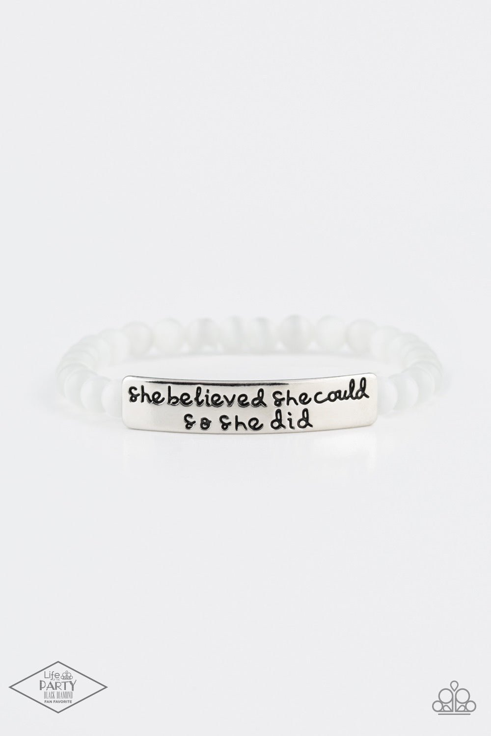 A collection of dainty white cat’s eye stone beads and an antiqued frame stamped in the inspirational phrase, “She believed she could, so she did” are threaded along a stretchy band around the wrist for a whimsical fashion.