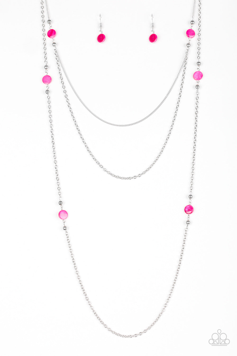 Brushed in a shell-like shimmer, iridescent pink beads and dainty silver beads trickle along glistening silver chains for a seasonal look.
