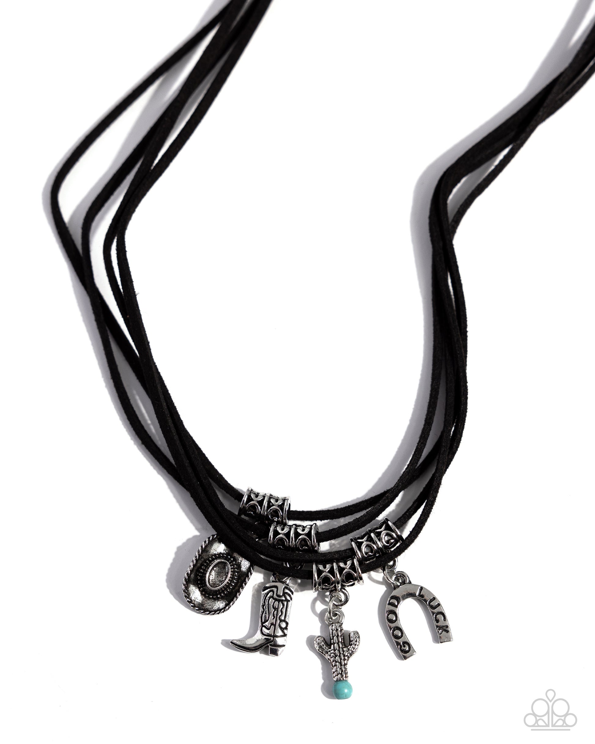 Infused along multiple black suede strands, a collection of silver Western-inspired charms, including a cowboy hat, cowboy boot, horseshoe, and turquoise-dotted cactus swing below the collar. Features an adjustable clasp closure. As the stone elements in this piece are natural, some color variation is normal.