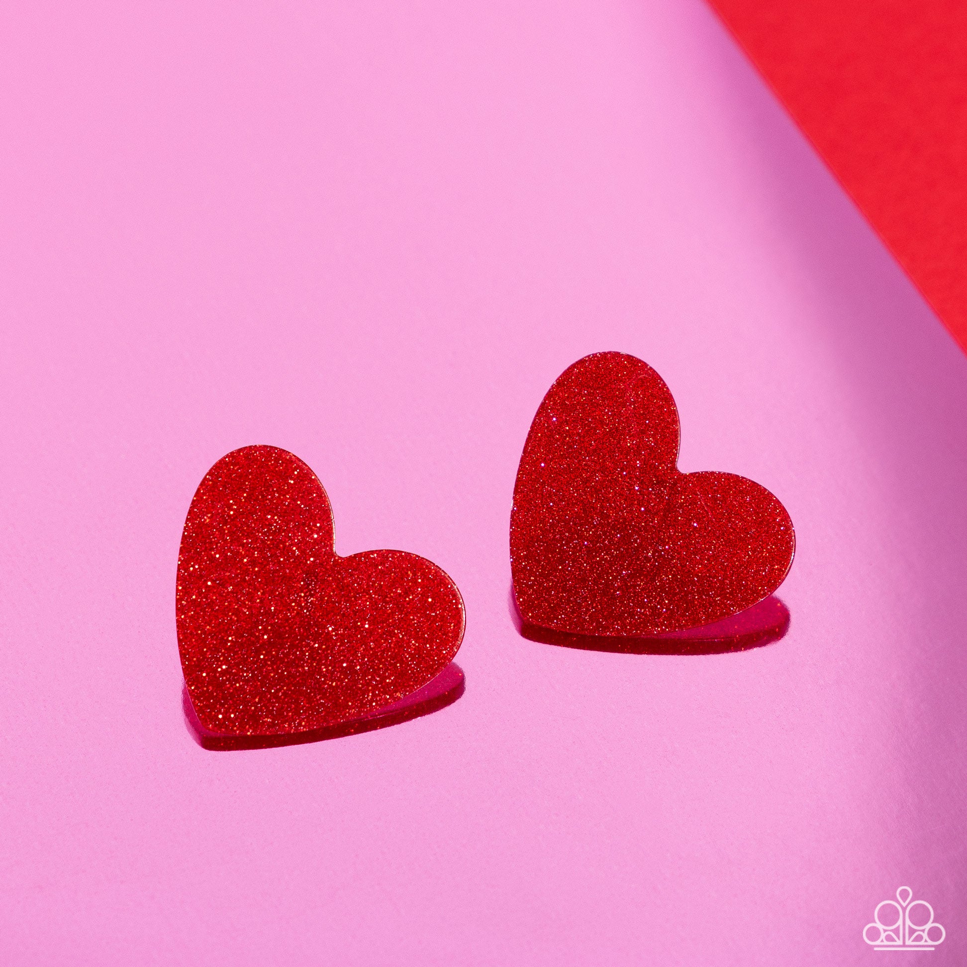 Dusted in sparkles, a red acrylic flat heart frame shimmers and shines from the ear for a flirtatious finish. Earring attaches to a standard post fitting.