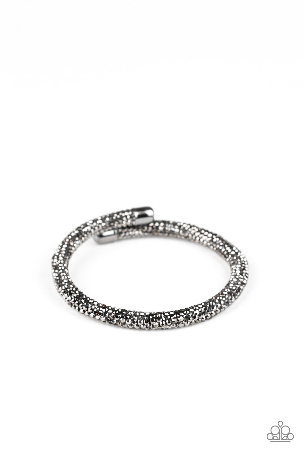 Bedazzled in glittery hematite rhinestones, a bendable cuff-like bracelet delicately curls around the wrist for a refined look.