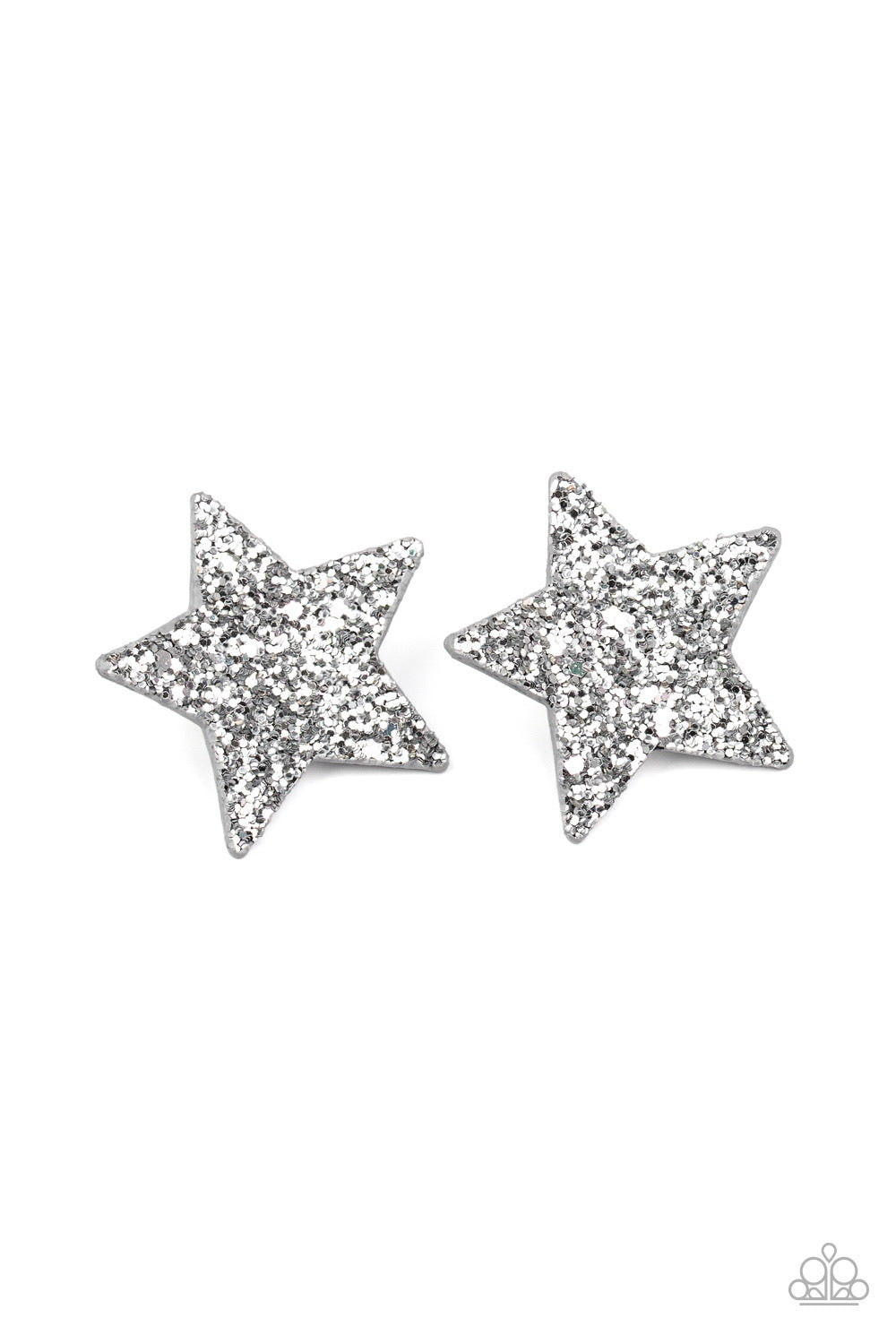 Sprinkled in glittery silver sequins, a sparkling pair of stars are attached to clips on the back for a patriotic inspired fashion. Features standard snap clips.