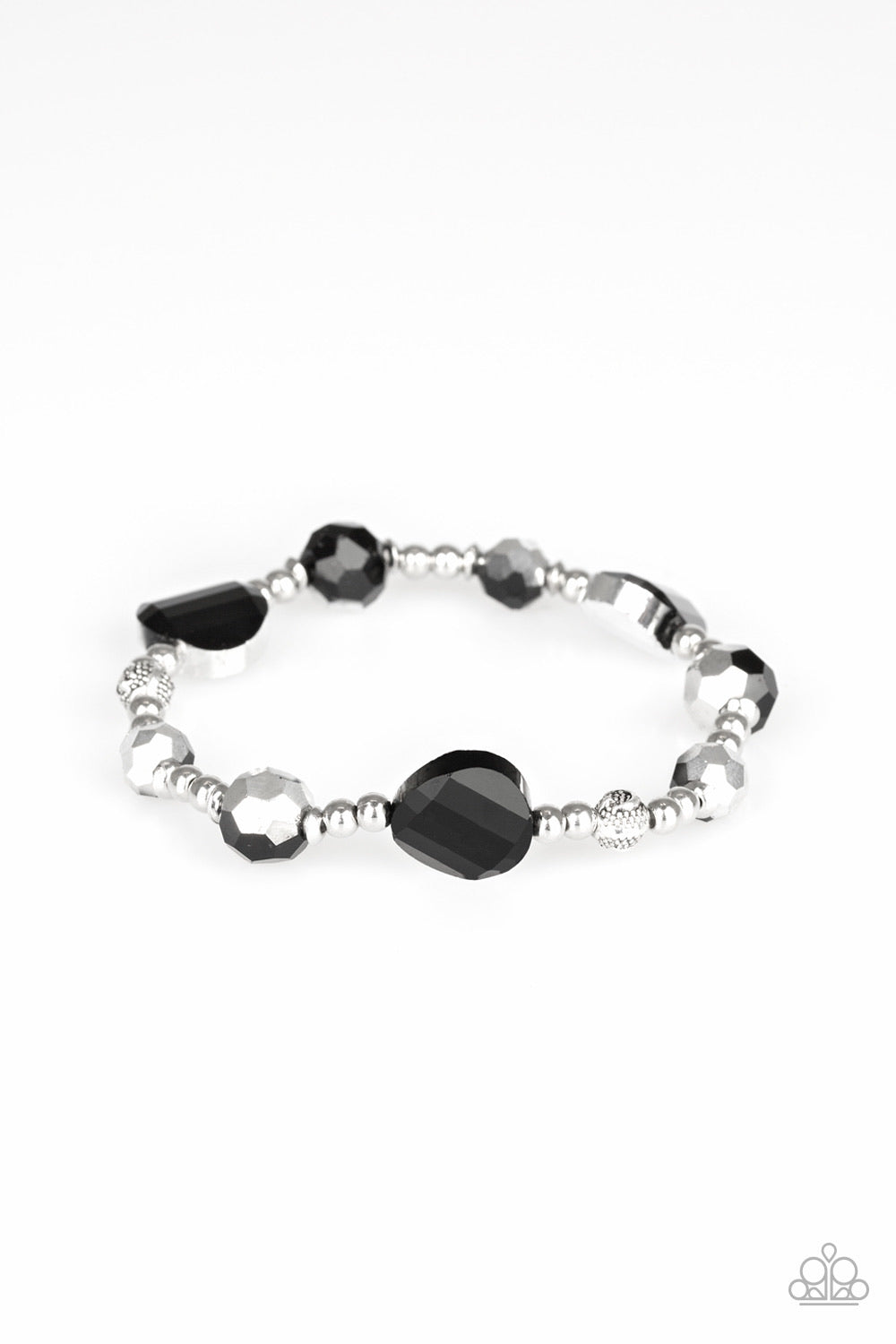 Brushed in a metallic shimmer, a collection of glittery black beads and shiny silver beads are threaded along a stretchy band around the wrist for a refined look