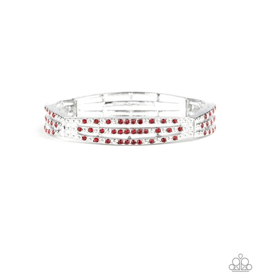 Sporadically dotted in rows of glittery red rhinestones and shiny silver studs, stacked silver frames are threaded along a stretchy band around the wrist for a refined look.