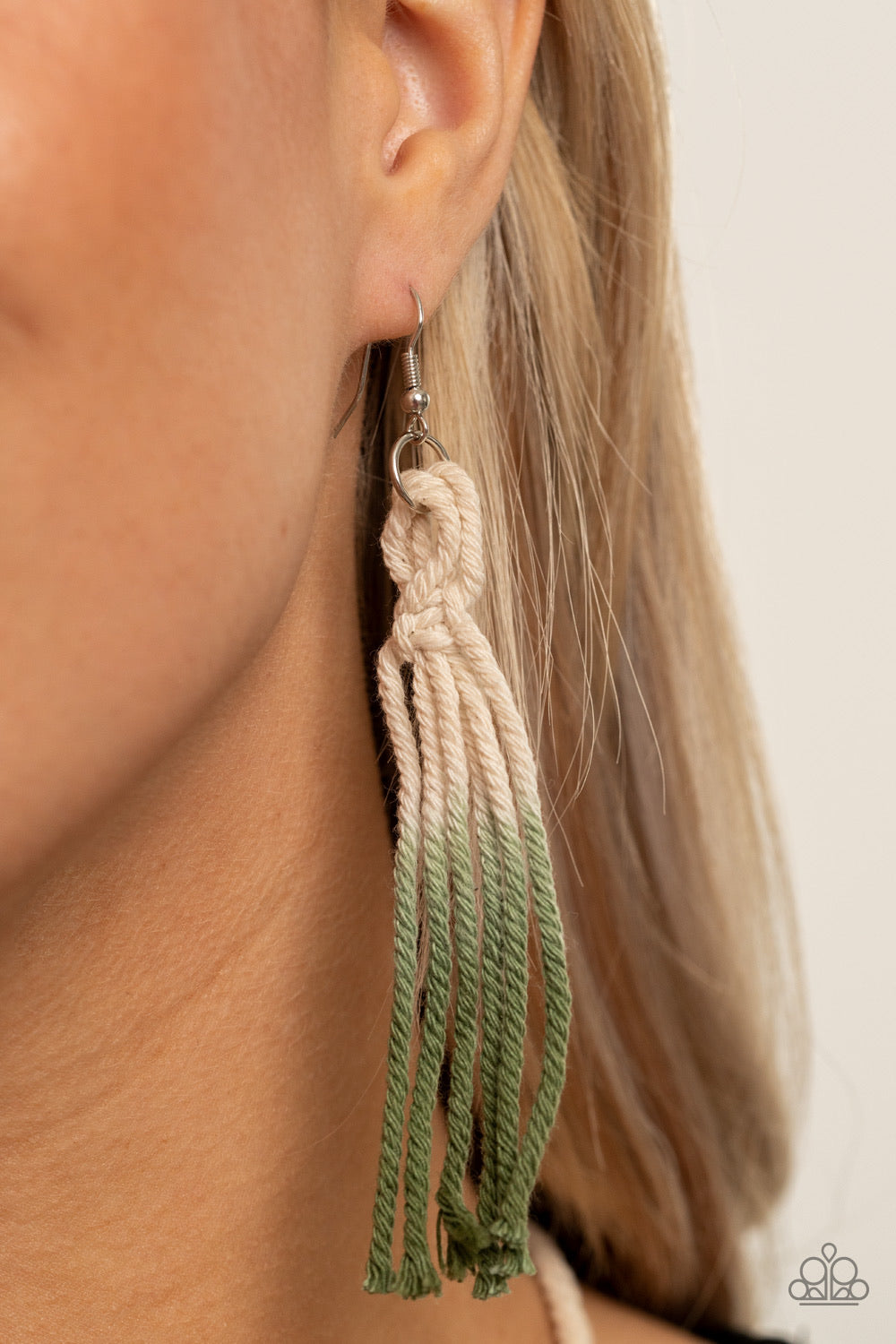 Gradually fading from white to Military Olive, strands of twine-like cording delicately knot in braid into a decorative macramé inspired pendant across the chest. Features an adjustable sliding knot closure.