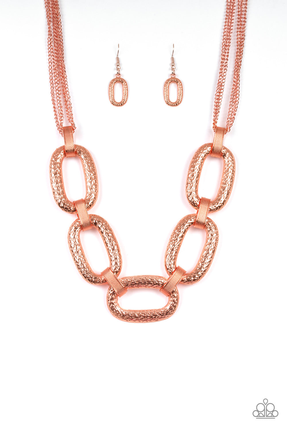 Delicately hammered in blinding shimmer, oversized shiny copper chain links and textured fittings connect below the collar. Suspended from strands of shiny copper chains, the bold links catch and reflect the light for a statement-making finish. Features an adjustable clasp closure.