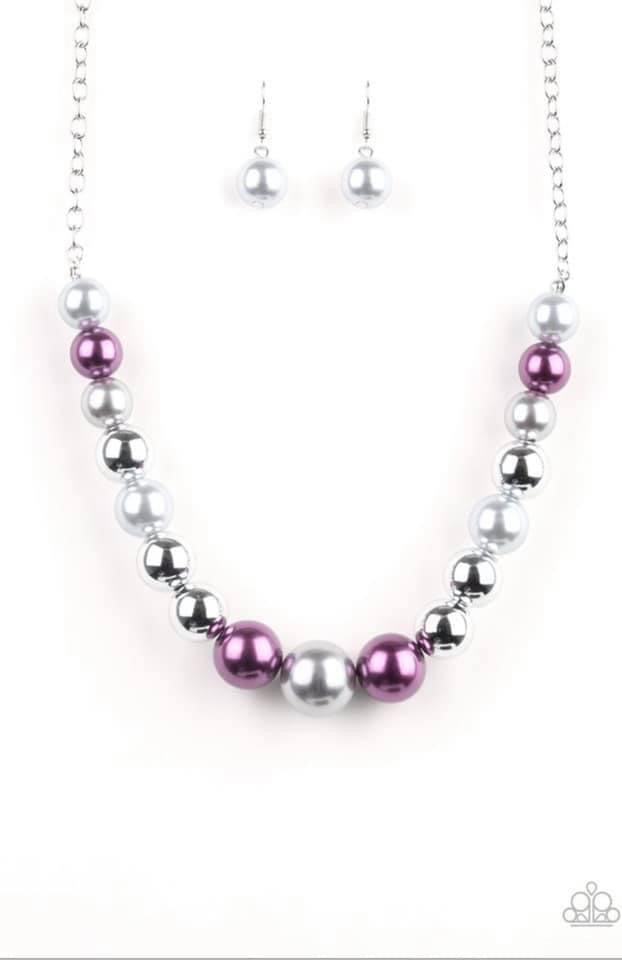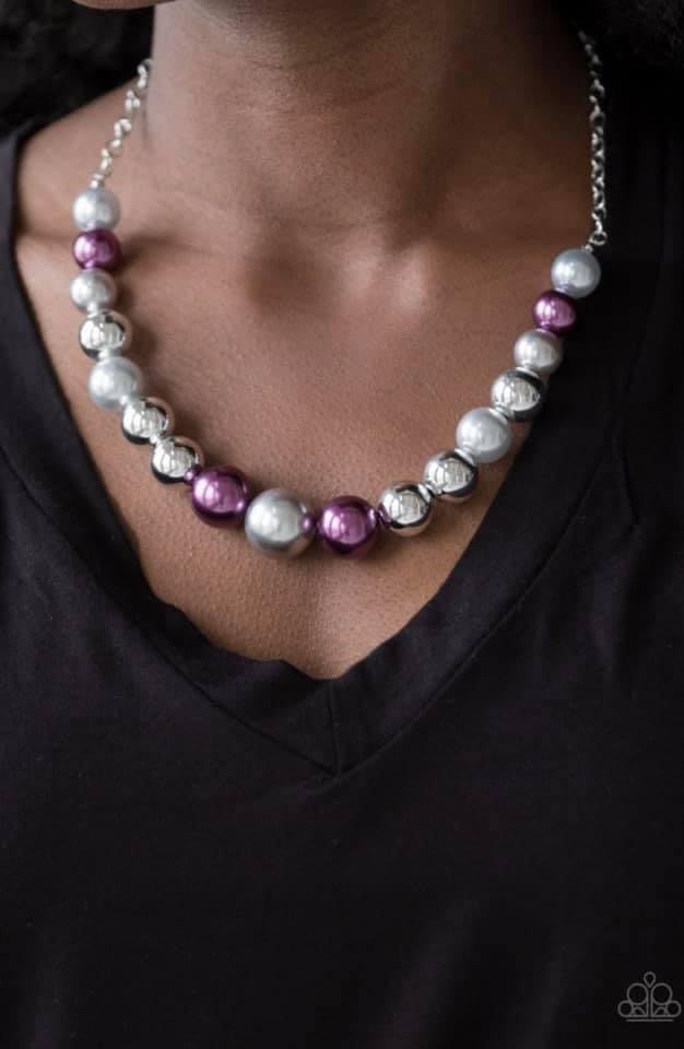 A collection of oversized silver and pearly purple and gray beads drape across the chest for a refined look. Features an adjustable clasp closure.