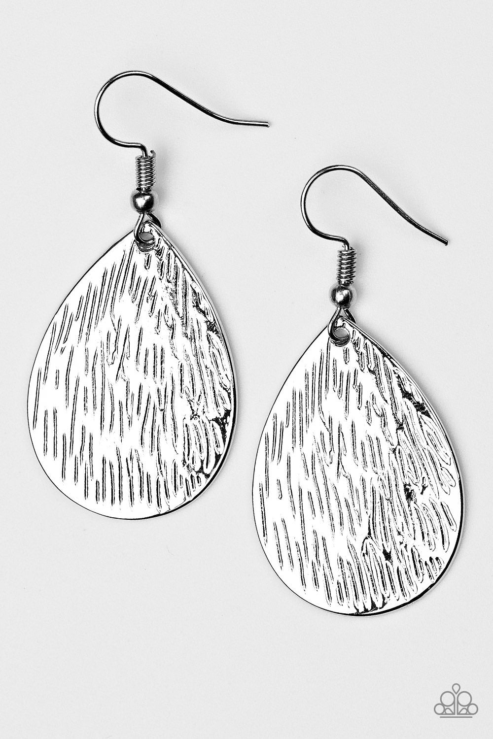 Delicately scratched in shimmery texture, a glistening silver teardrop swings from the ear for a simple artisan look. Earring attaches to a standard fishhook fitting.