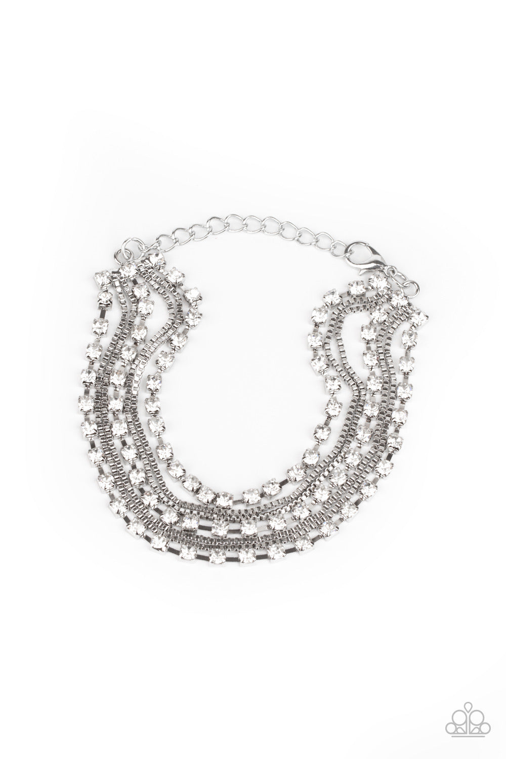 Strands of glittery white rhinestones and rows of dainty silver box chains alternate across the wrist, layering into a sassy display of sparkle. Features an adjustable clasp closure.