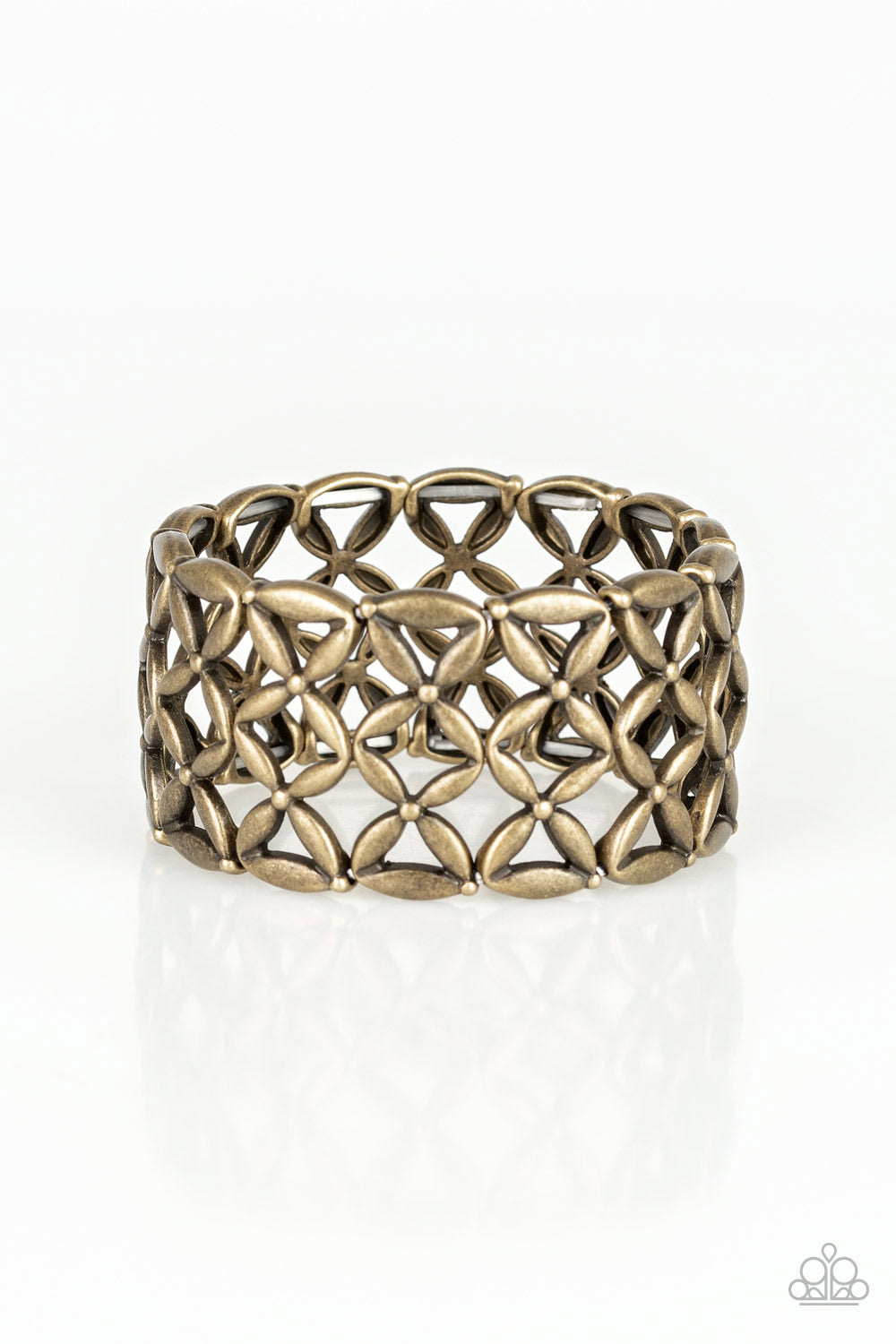 Shimmery brass floral frames are threaded along a stretchy band, stacking into a bold seasonal look.