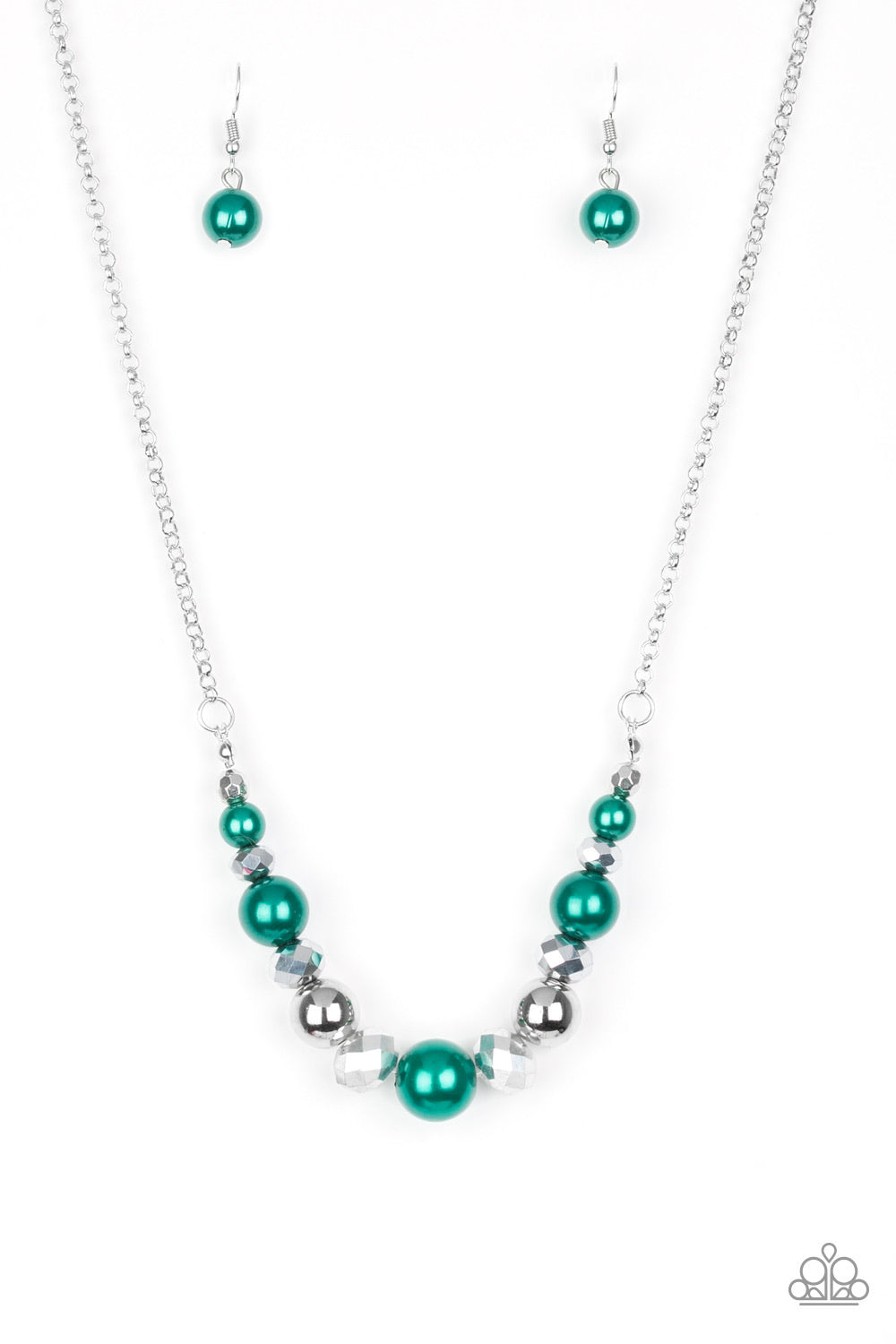 A collection of pearly green, classic silver, and crystal-like hematite beads are threaded along an invisible wire below the collar for a glamorous look. Features an adjustable clasp closure.