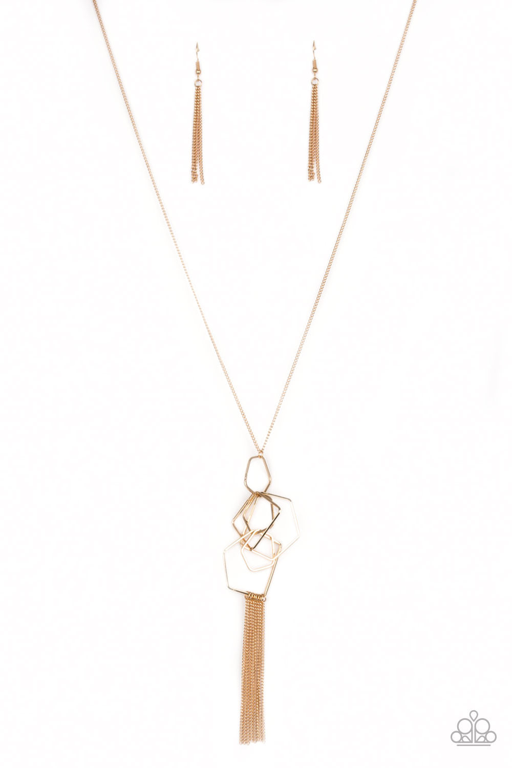 Glistening gold bars bend into airy pentagon shaped frames as they trickle from the bottom of an elongated gold chain, creating an edgy clustered pendant. A shiny gold tassel swings from the trendy geometric pendant for a flirtatious finish. Features an adjustable clasp closure.