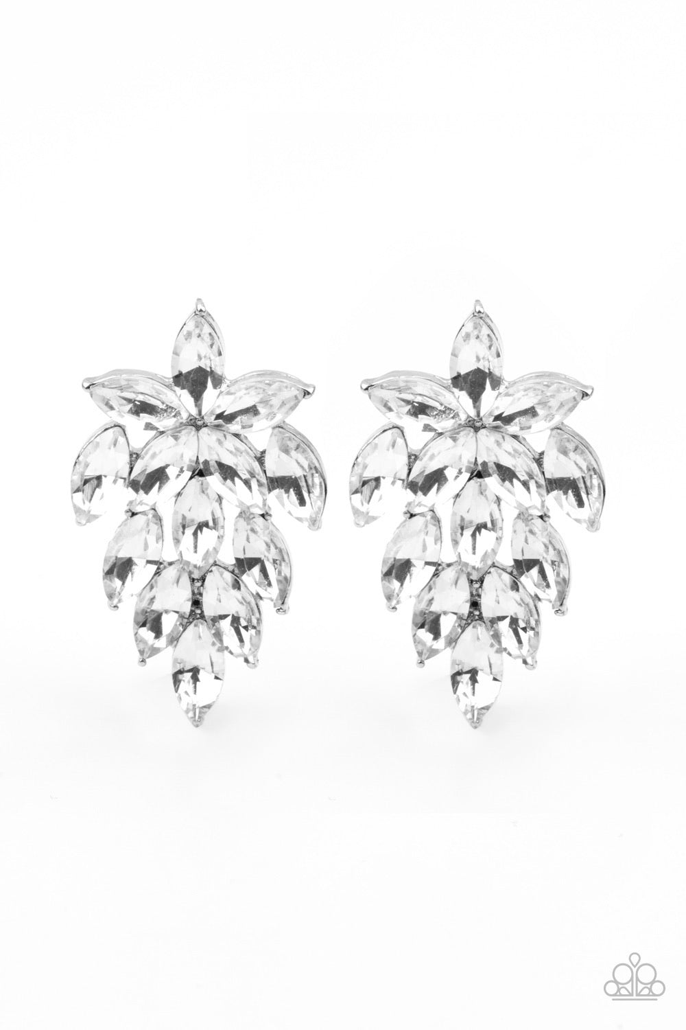 Featuring dainty silver studded accents, a sparkly collection of marquise cut white rhinestones flare out from the bottom of floral arranged rhinestones for a flauntable finish. Earring attaches to a standard post fitting.