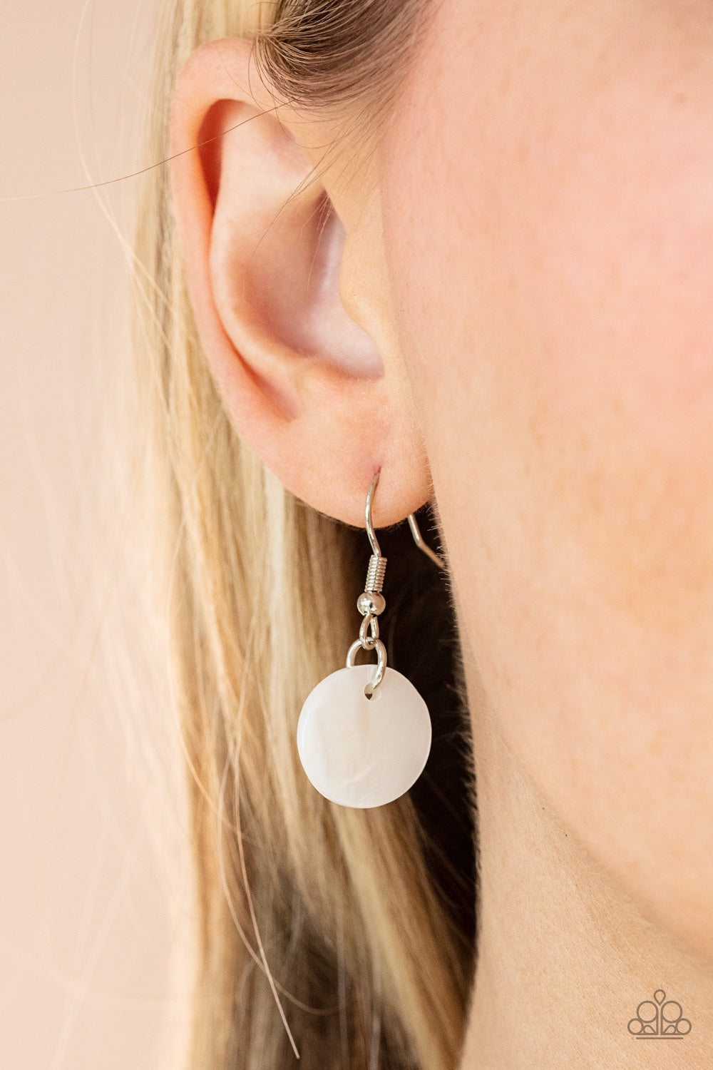 Featuring a glistening iridescence, a white shell-like disc attaches to a shiny silver frame at the bottom of a lengthened silver chain, creating a summery pendant. Features an adjustable clasp closure.