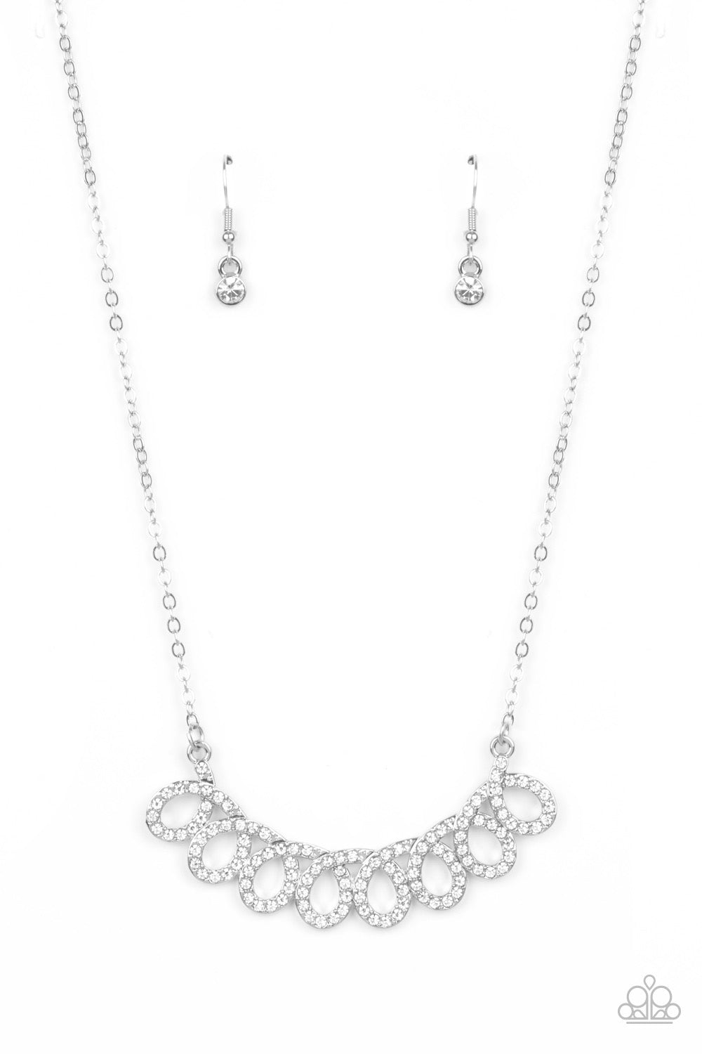 A white rhinestone encrusted silver ribbon delicately loops below the collar, coalescing into a timelessly stationary statement piece. Features an adjustable clasp closure.