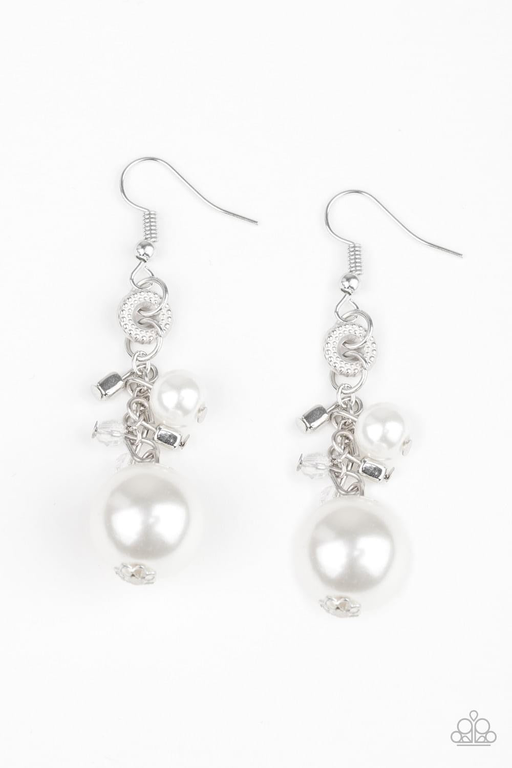 A bubbly white pearl, glassy crystal-like beads, and shimmery silver cube beads trickle along a glistening silver chain. An oversized white pearl swings from the bottom of the chain, creating a dramatic lure. Earring attaches to a standard fishhook.