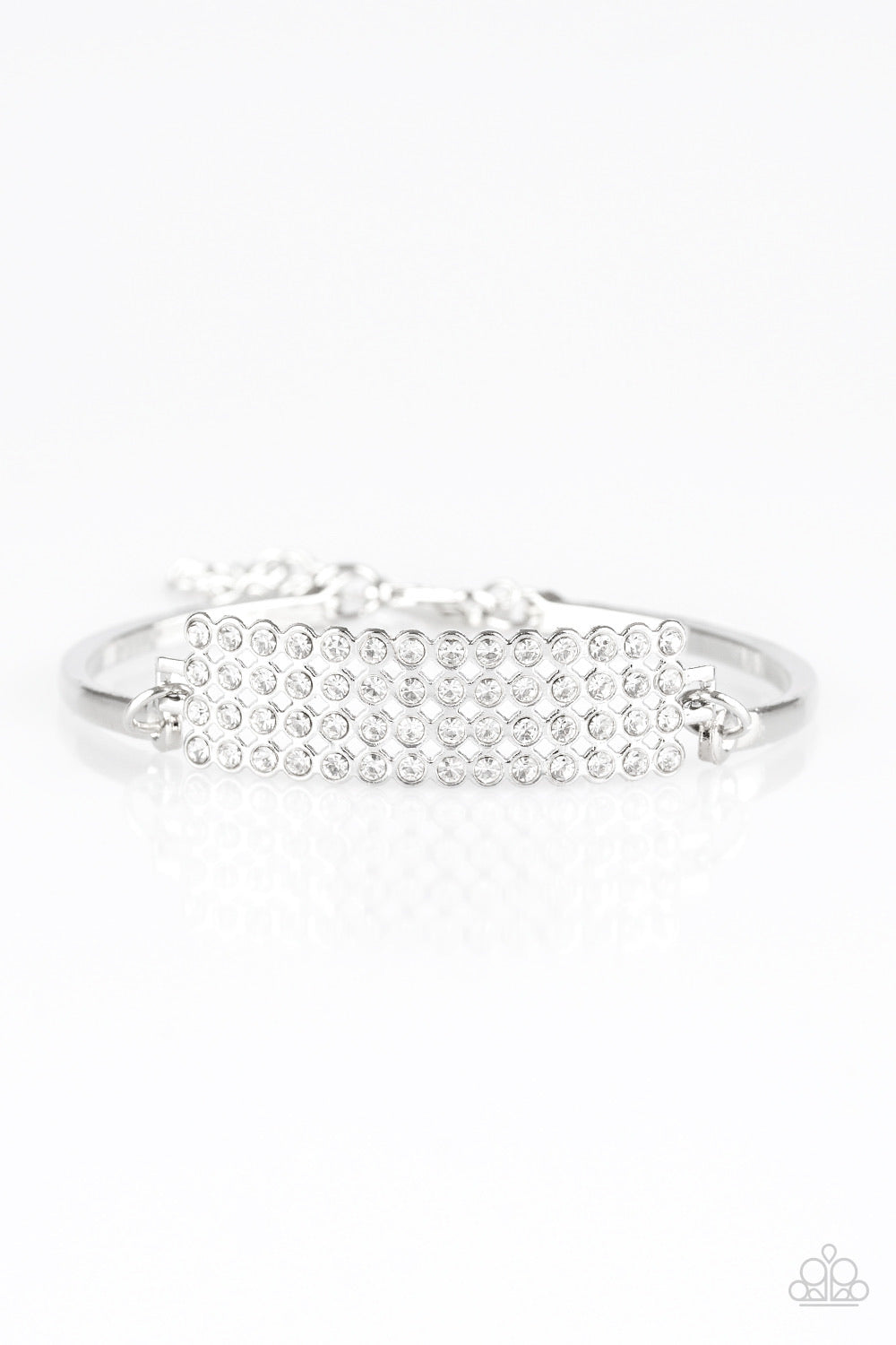 Row after row of glassy white rhinestones stack into a gorgeous rectangular pendant. Attached to two arcing silver bars, the glittery pendant sits atop the wrist for an undeniably glamorous look. Features an adjustable clasp closure.