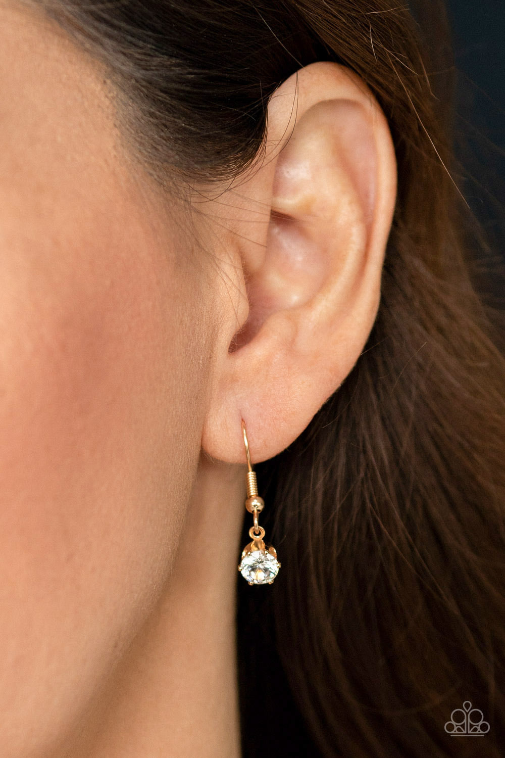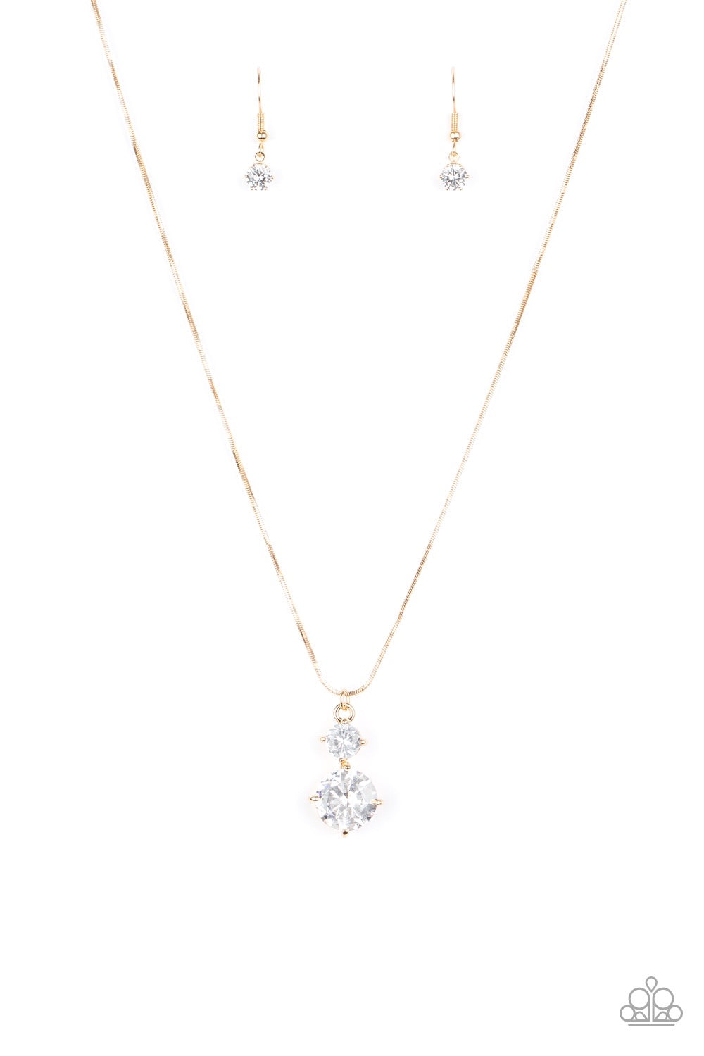 Nestled inside classic gold prongs, two oversized white rhinestones slide along a dainty gold snake chain, creating a dramatic pendant below the collar. Features an adjustable clasp closure.