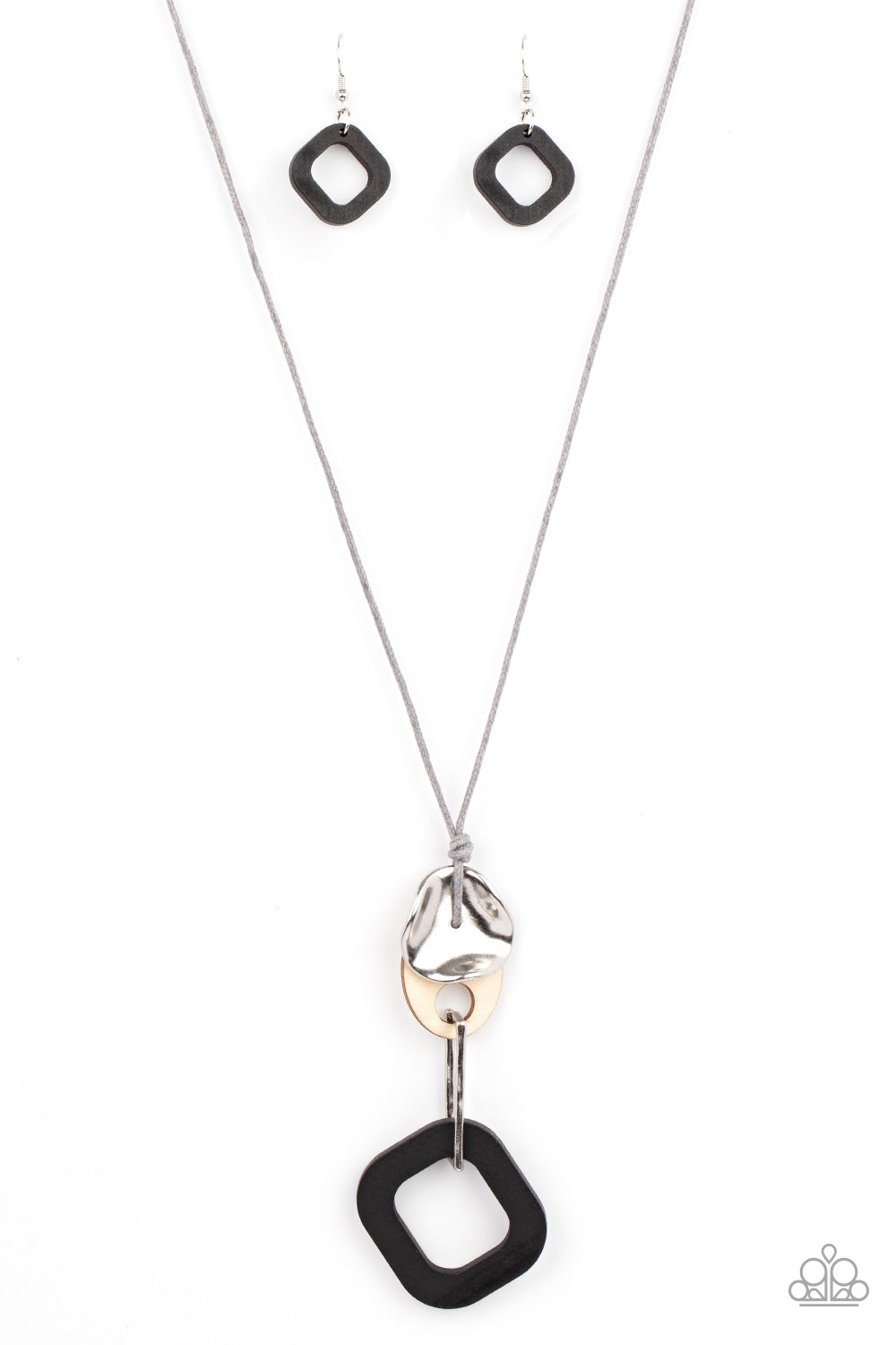 A hammered silver disc, brown wooden frame, hammered silver rectangular frame, and black wooden square frame link into an abstract pendant at the bottom of a gray cord. Features an adjustable clasp closure.
