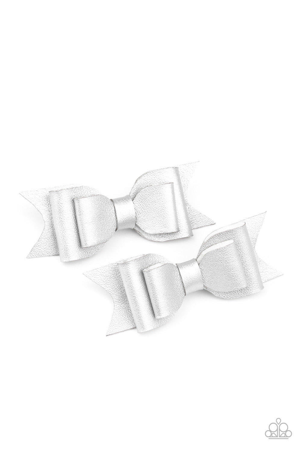Painted in a shimmery silver sheen, two leather ribbons fold into a pair of dainty bows, creating a charming duo. Features a standard hair clip on the back.