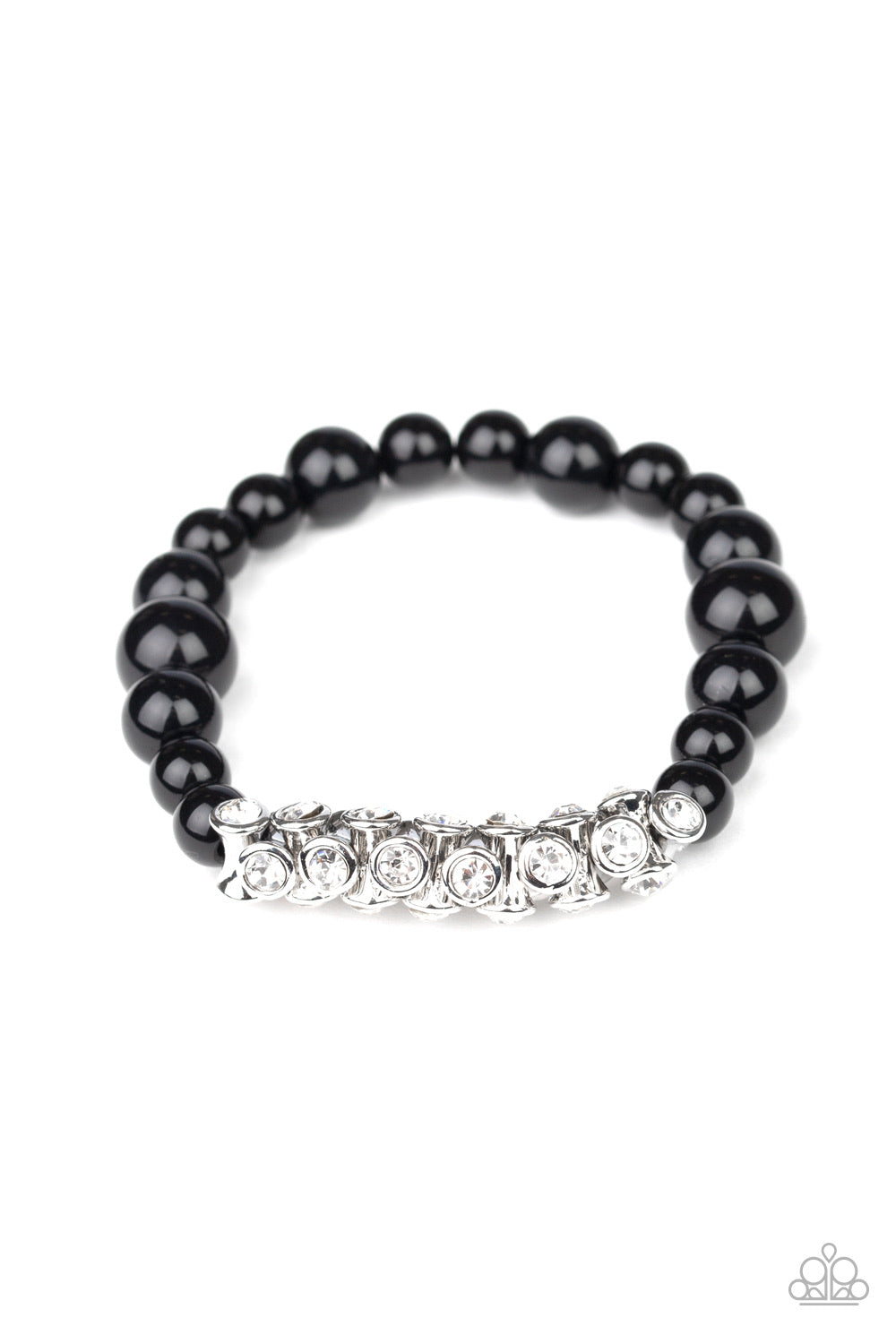 A collection of black beads and white rhinestone dotted silver frames are threaded along a stretchy band around the wrist, creating a sparkling centerpiece.