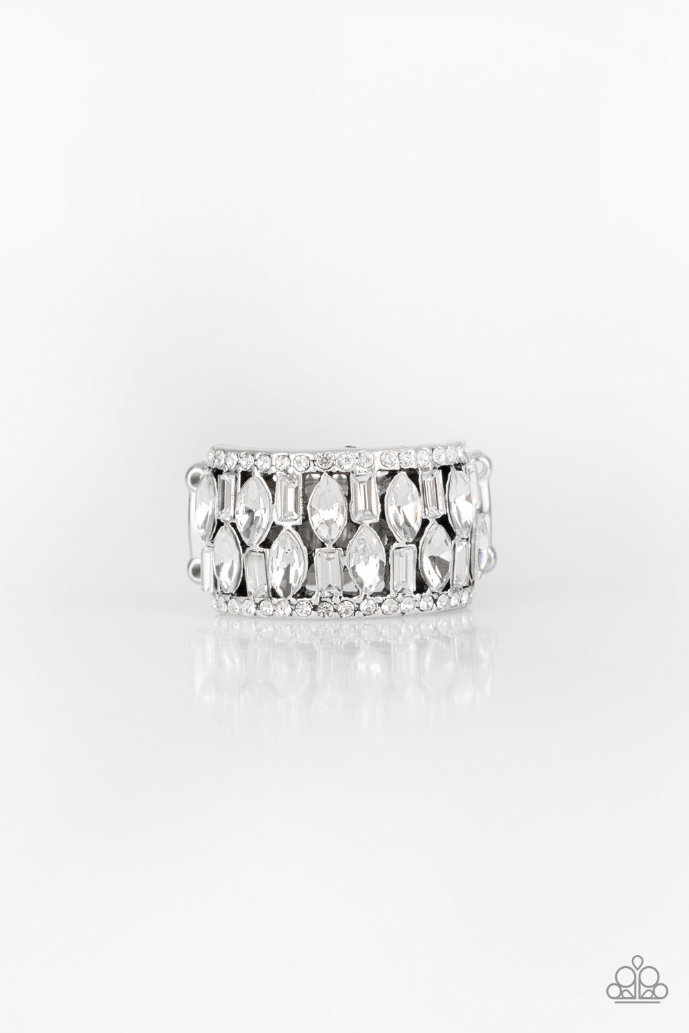 Featuring round, emerald, and marquise style cuts, glittery white rhinestones stack across the finger for a glamorous shimmer. Features a stretchy band for a flexible fit.