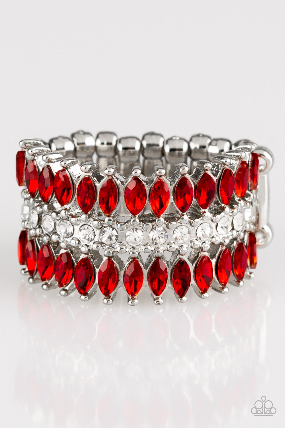 Featuring refined marquise cuts, glittery red rhinestones flare from a center of glassy white rhinestones, creating a regal band across the finger. Features a stretchy band for a flexible fit.