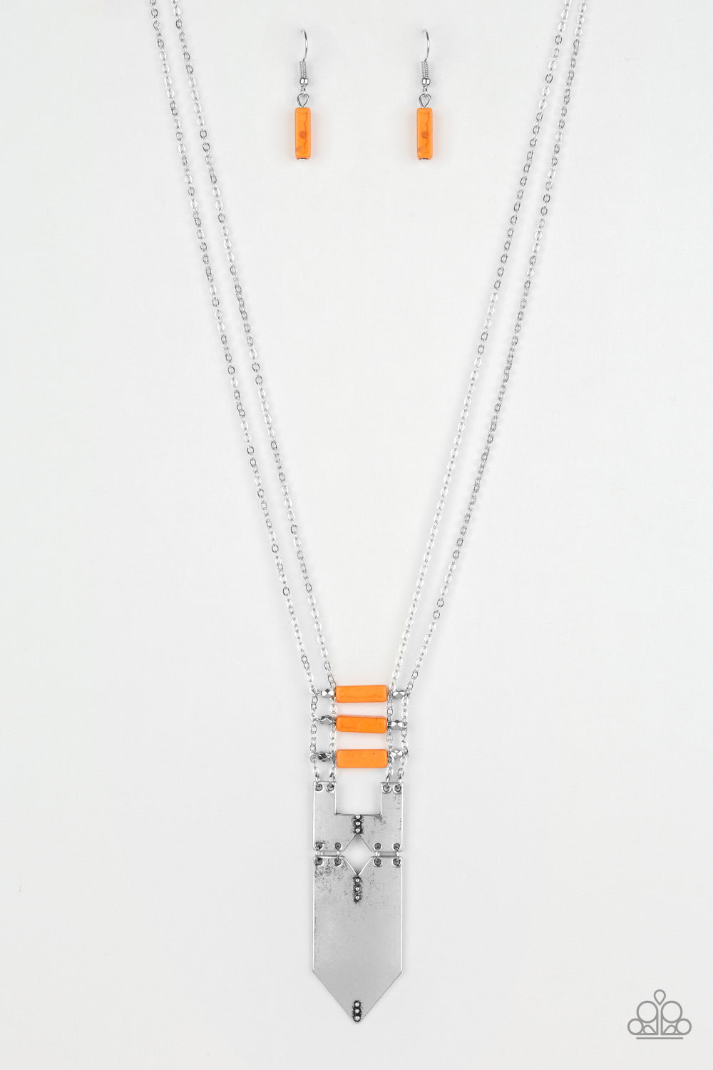 Dotted in sections of dainty silver studs, shiny silver plates connect at the bottoms of double silver chains. Infused with faceted silver accents, a row of rectangular orange stones give way to the tribal inspired plates for an authentic artisan finish. Features an adjustable clasp closure.