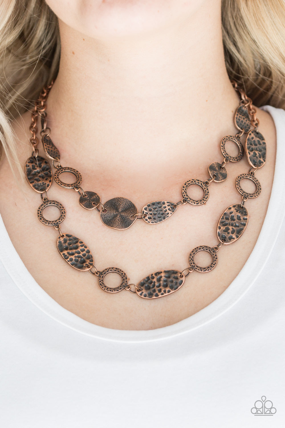 Delicately hammered in shimmery textures, mismatched copper frames link below the collar in two seasonal layers. Features an adjustable clasp closure.