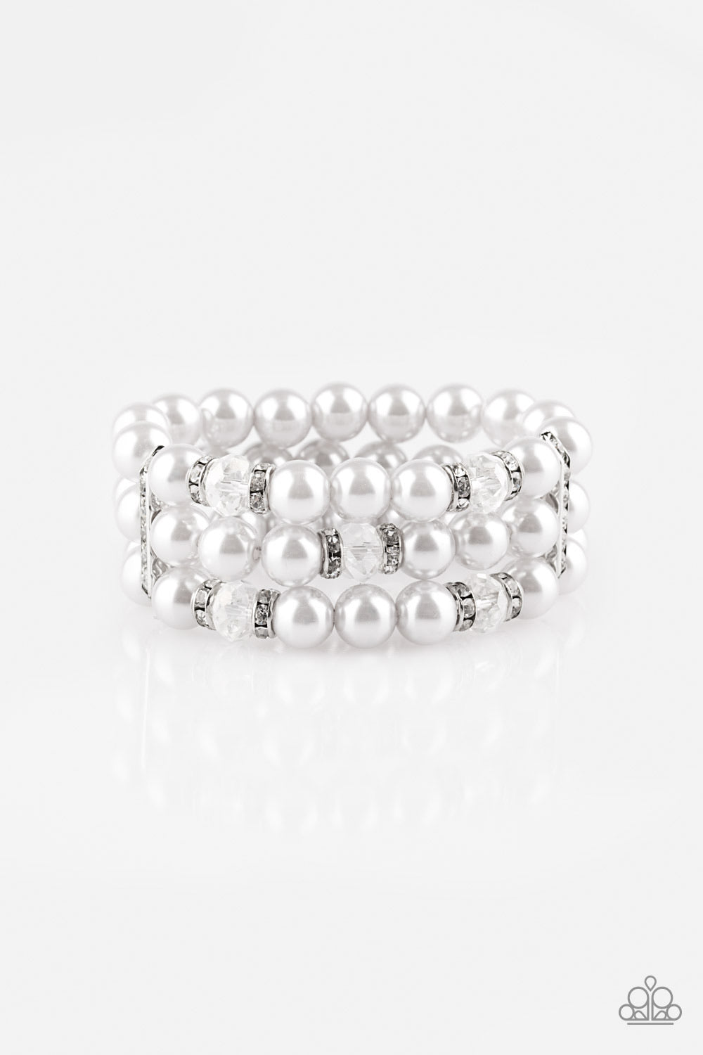 Pinched between white rhinestone encrusted frames, white rhinestone encrusted rings, crystal-beads, and silver pearls are threaded along elastic stretchy bands for a glamorous look.