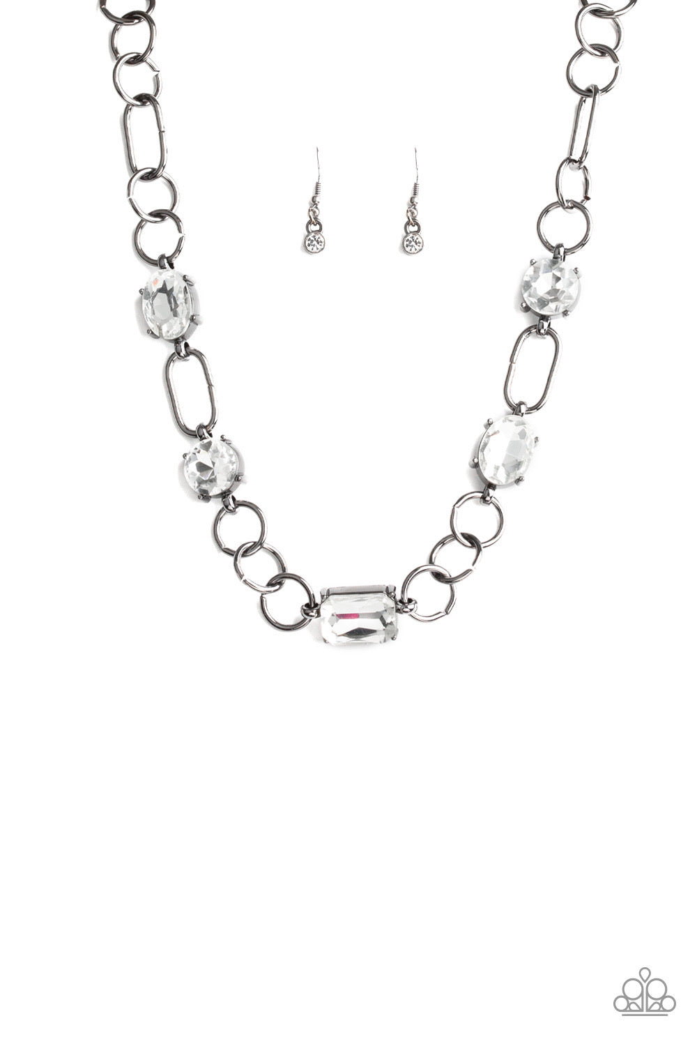 Featuring round, oval, and emerald style cuts, glittery white rhinestone fittings link with mismatched gunmetal rings below the collar for an edgy glamorous look. Features an adjustable clasp closure.