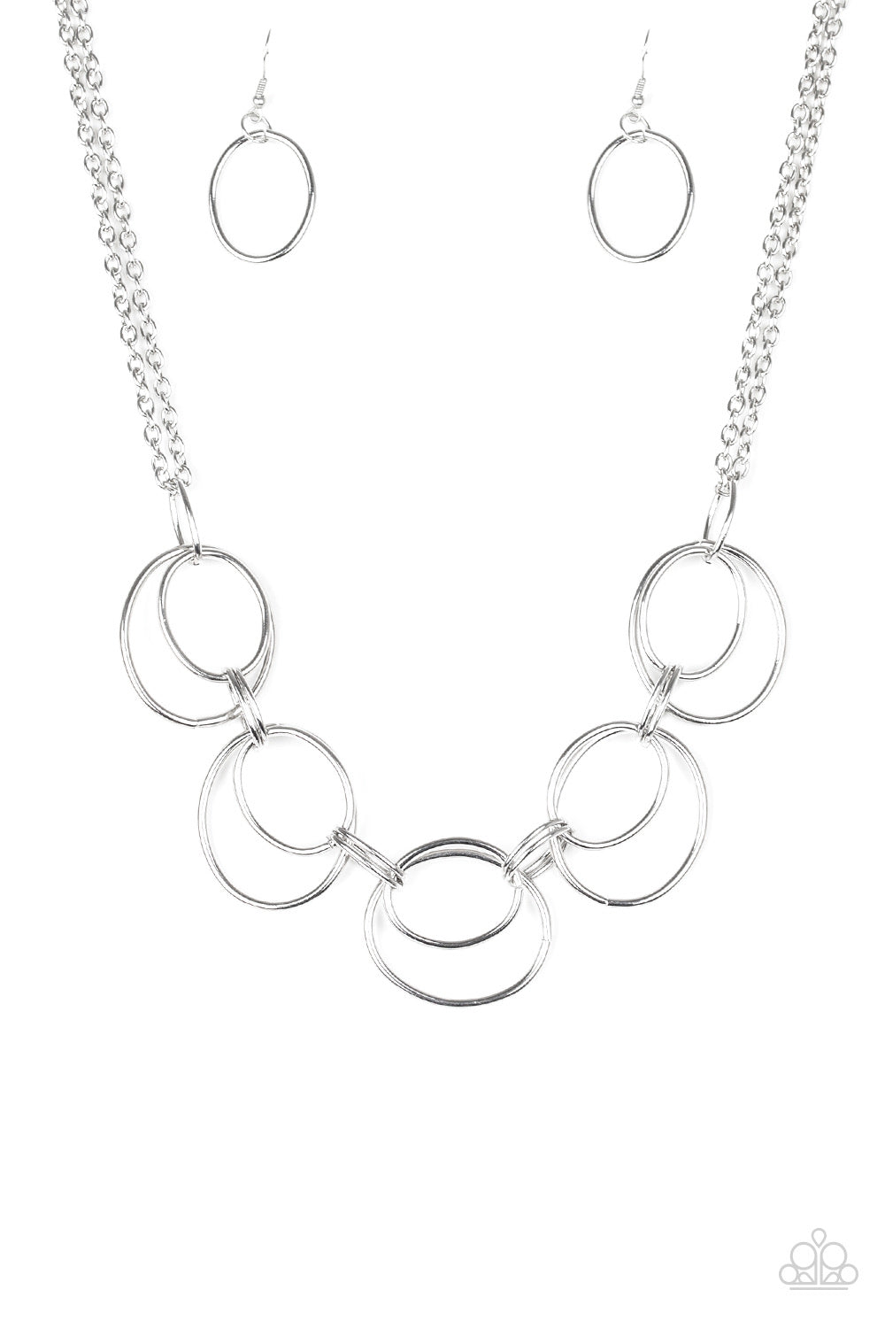 Doubled silver hoops link below the collar for a bold industrial look. Features an adjustable clasp closure.