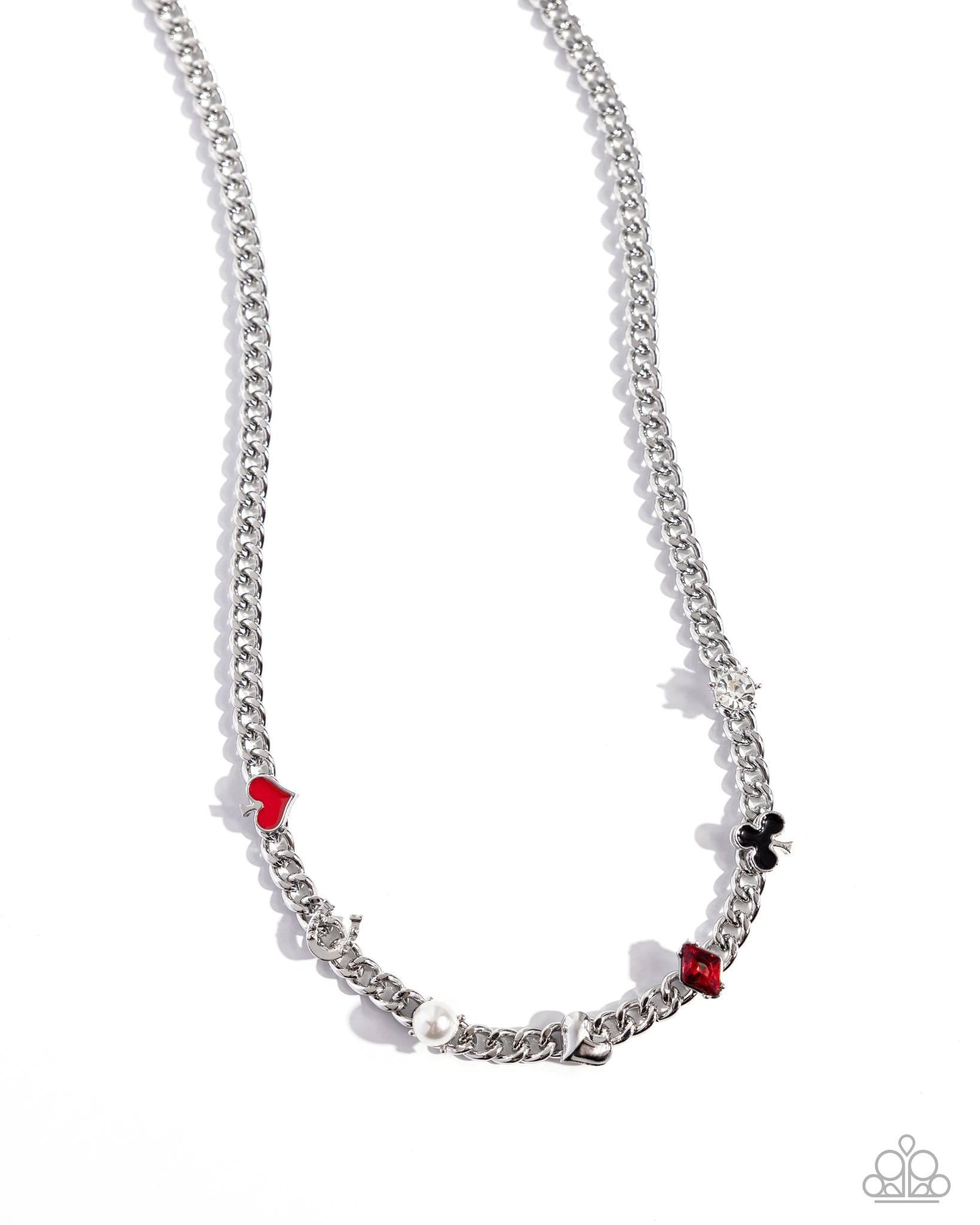 Pronged in place along a high-sheen silver curb chain, a Vegas-styled collection of charms shimmer along the neckline. The various charms include a white pearl, silver heart, white gem, white rhinestone-encrusted horseshoe, a red-painted spade, a black-painted club, and a red diamond gem. Features an adjustable clasp closure.