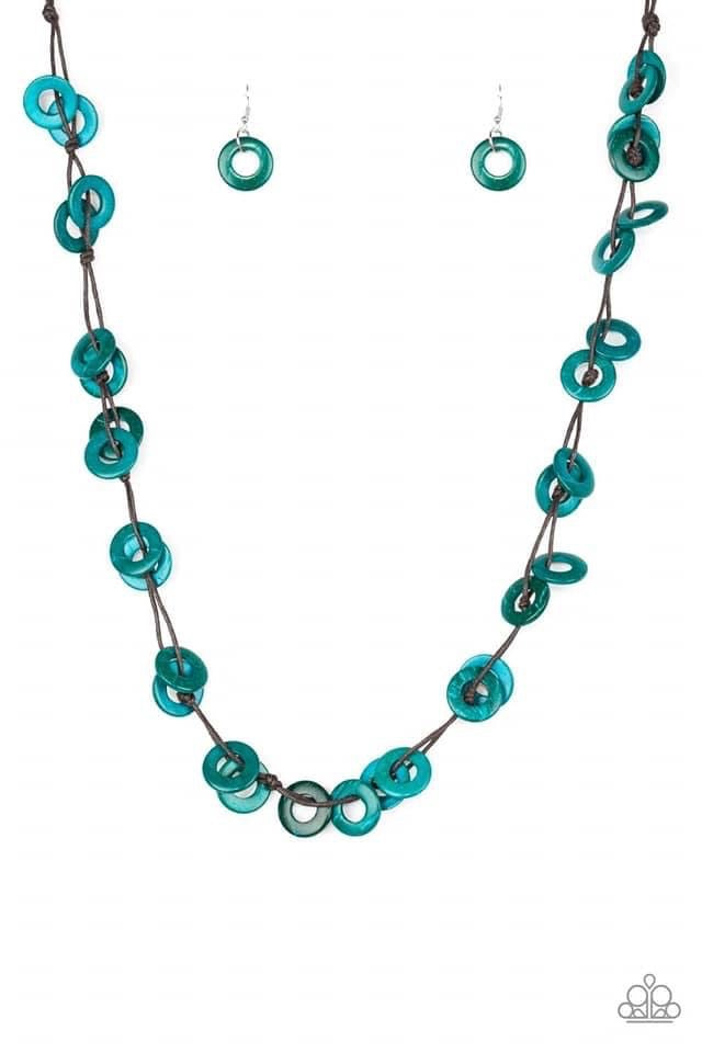 Shiny brown cording knots around refreshing blue wooden discs, creating a colorful display across the chest. Features a button loop closure.