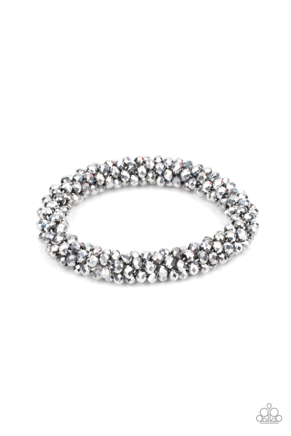 Sparkling with brilliance, a collection of dainty faceted silver beads are threaded along a woven stretchy band creating a stunning statement around the wrist.