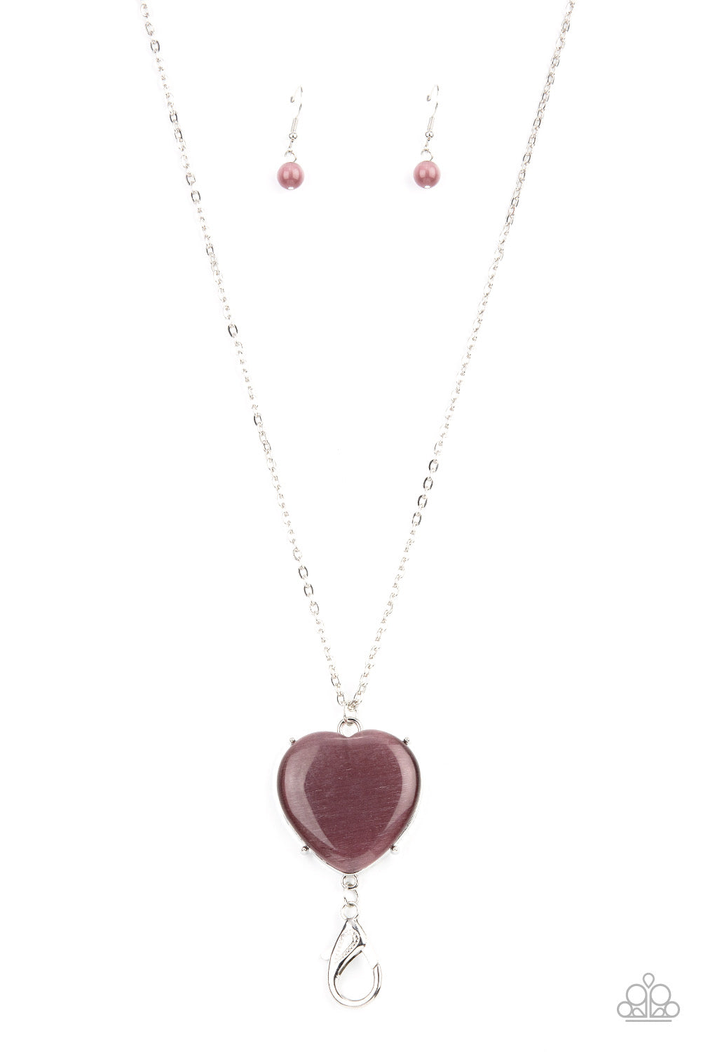 An oversized purple cat's eye stone frame swings from the bottom of a lengthened silver chain, creating a flirtatious pendant. A lobster clasp hangs from the bottom of the design to allow a name badge or other item to be attached. Features an adjustable clasp closure.