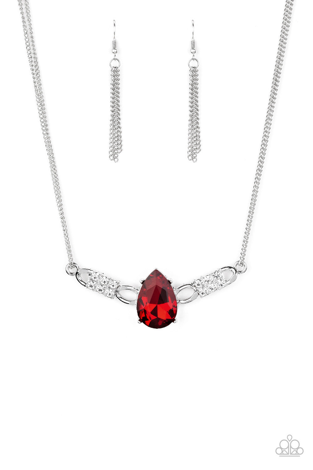 Cut into an alluring teardrop, an oversized red rhinestone gem attaches to bold silver frames radiating with glassy white rhinestones. The dramatic pendant attaches to doubled silver chains, swinging horizontally below the collar in a glamorous fashion. Features an adjustable clasp closure.