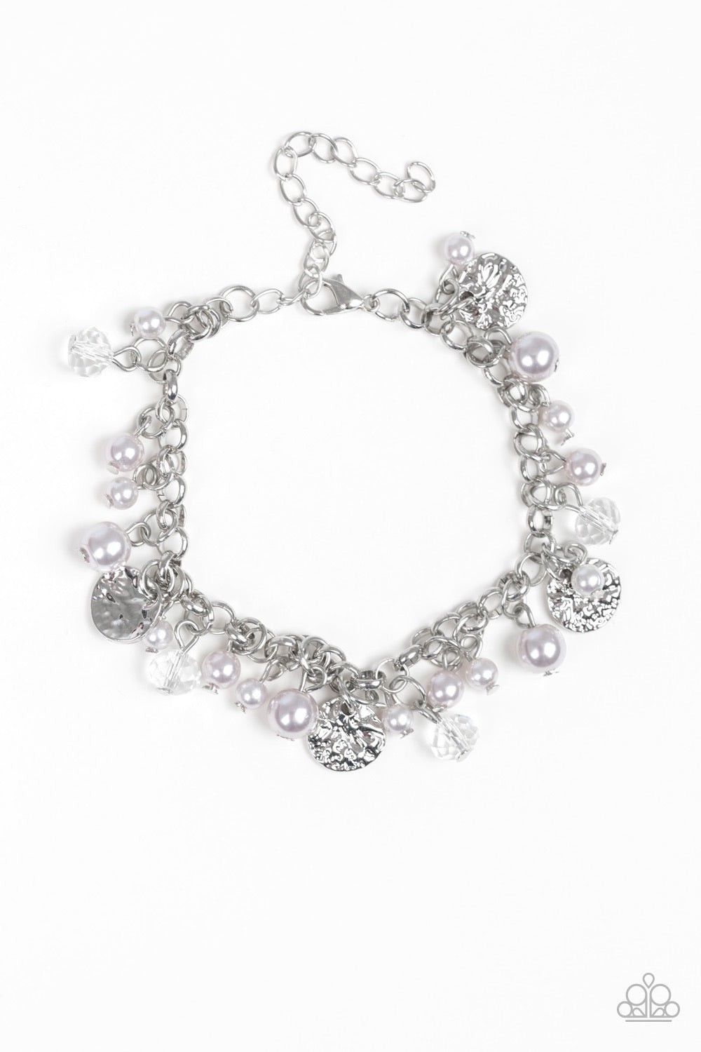 Pearly silver beads, smoky crystal-like gems, and hammered silver discs swing from a bold silver chain, creating a refined fringe around the wrist. Features an adjustable clasp closure.