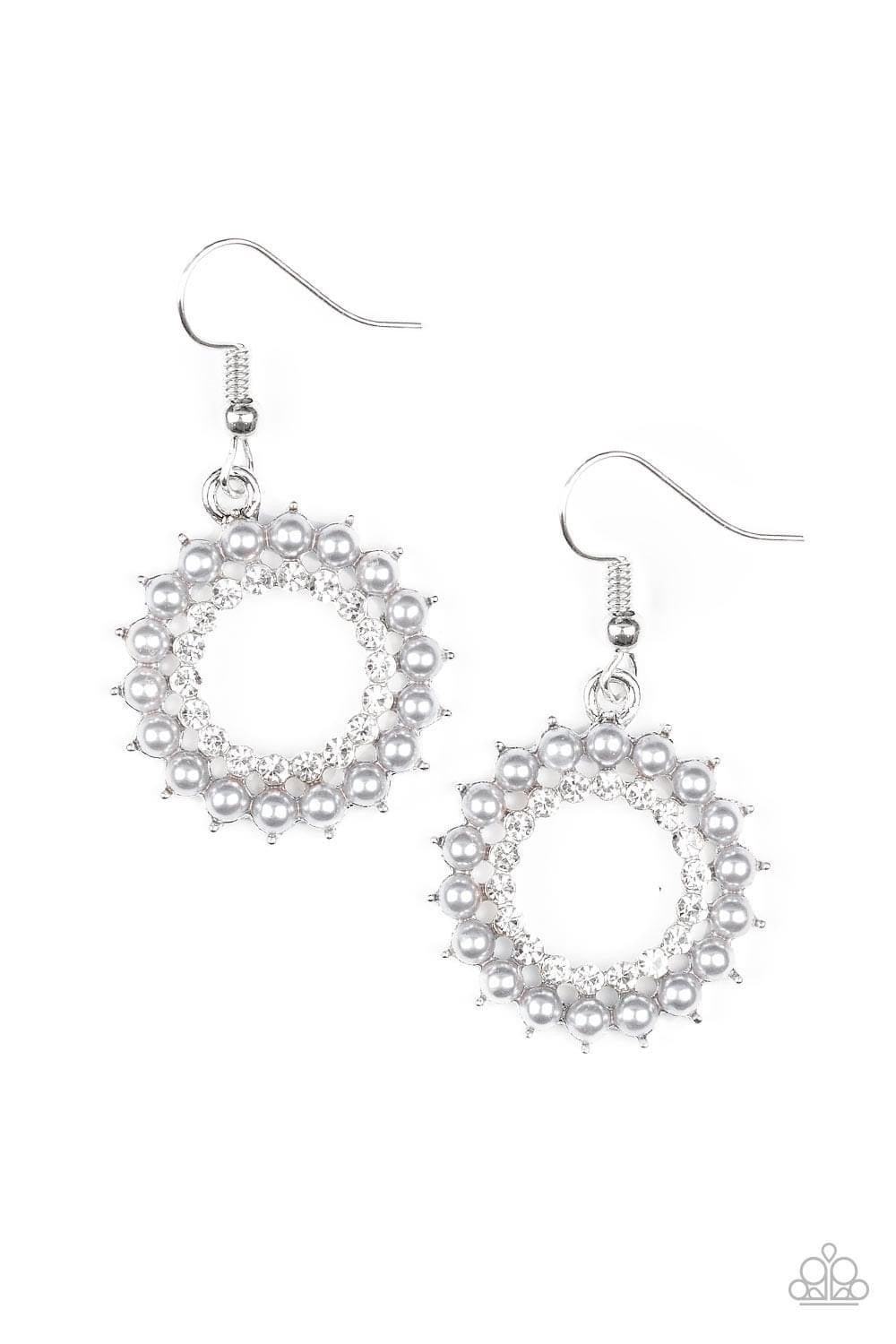 Dainty silver pearls spin around a radiant white rhinestone center, coalescing into a refined hoop. Earring attaches to a standard fishhook fitting.